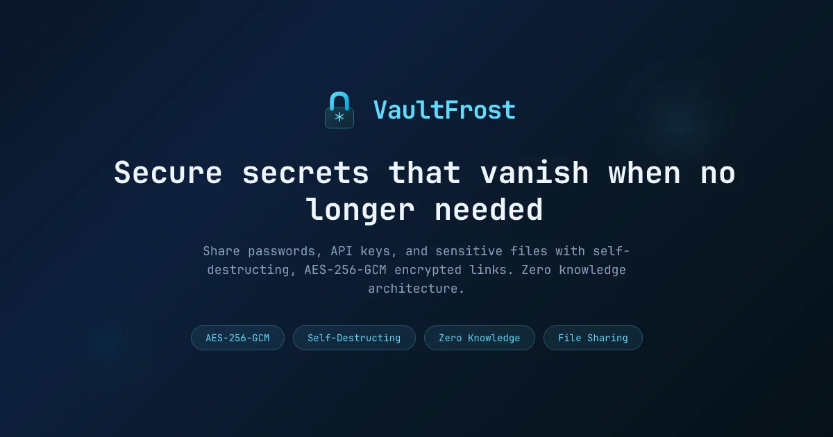 VaultFrost is a privacy-first secret sharing platform designed for developers, teams, and organizations that need to transmit sensitive information safely.